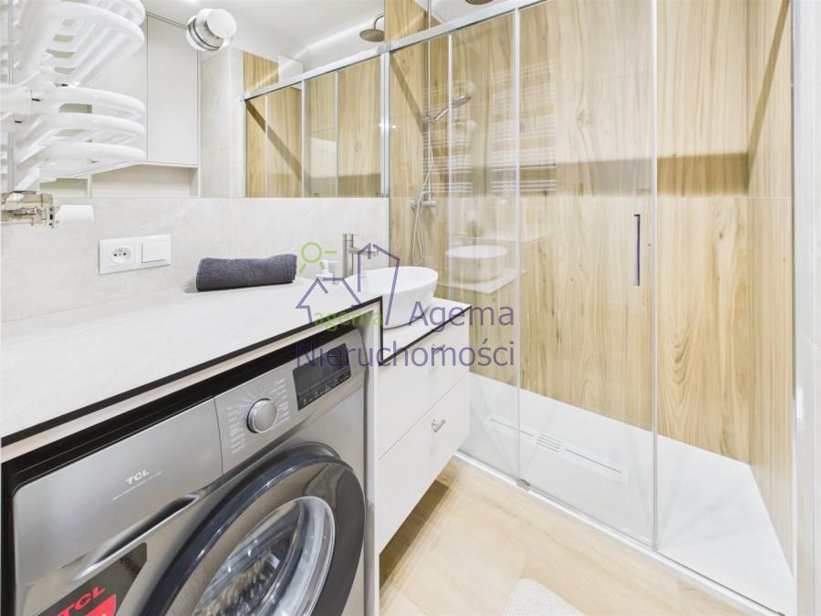 łazienka z kabiną prysznicową i zabudową na wymiar, pralka